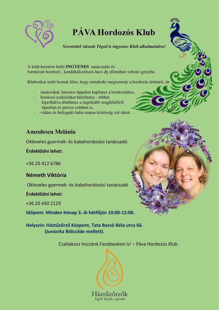 Sok szeretettel várunk INGYENES és GYERMEKBARÁT Páva Hordozós Klubunkon! Minden hónap 3. csütörtökön 10:15-tól 11:45-ig, Tatán, a Háztűzőrző Központban. Cím: 2890 Tata Bacsó Béla u. 66/1. GPS Koordináta: 47.6656 18.3224 (Juniorka Óvoda mellett) Információ: Amzulescu Melánia, PÁVA Hordozós Klub vezetője, Okl. Baba- és gyermekhordozási tanácsadó +36 20 412 6786 melania.amzulescu@gmail.com Németh Viktória, PÁVA Hordozós Klub […]